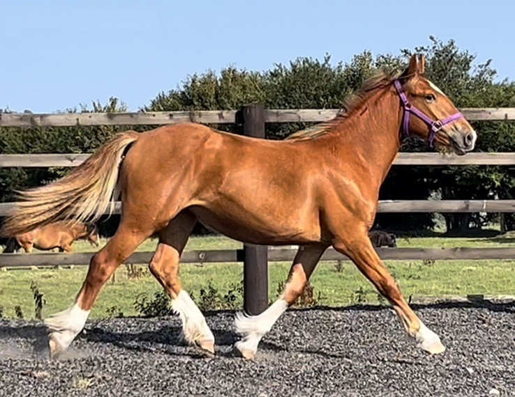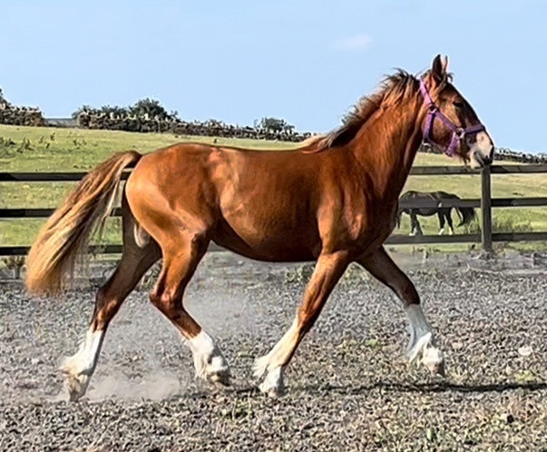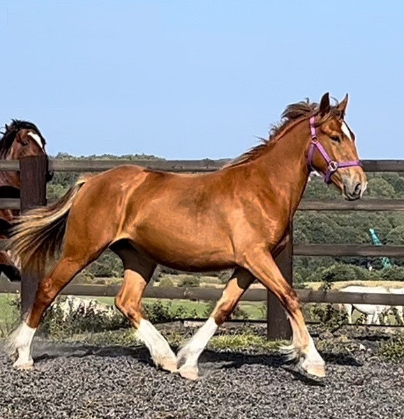 Cyrilla is a stunning 1-year-and-4-month-old Irish Draught chestnut filly standing at 16.1hh, expected to mature to 16.2hh. Athletic, well-handled, and showing excellent movement, she is an ideal young sport horse prospect for eventing, hunting, or all-round work.