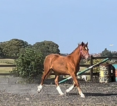 In StockCyrilla is a beautiful Irish Draught chestnut filly, aged 1 year and 4 months, standing at 16.1 hands and expected to mature to 16.2hh. She is a non-registered Irish Draught, but all of her breeding is known. With four striking white socks and a confident, expressive presence, Cyrilla is a true standout youngster with tremendous athletic potential.